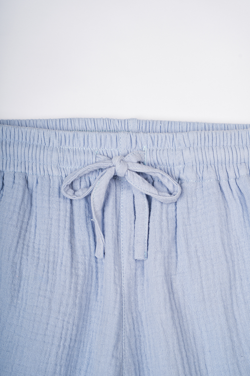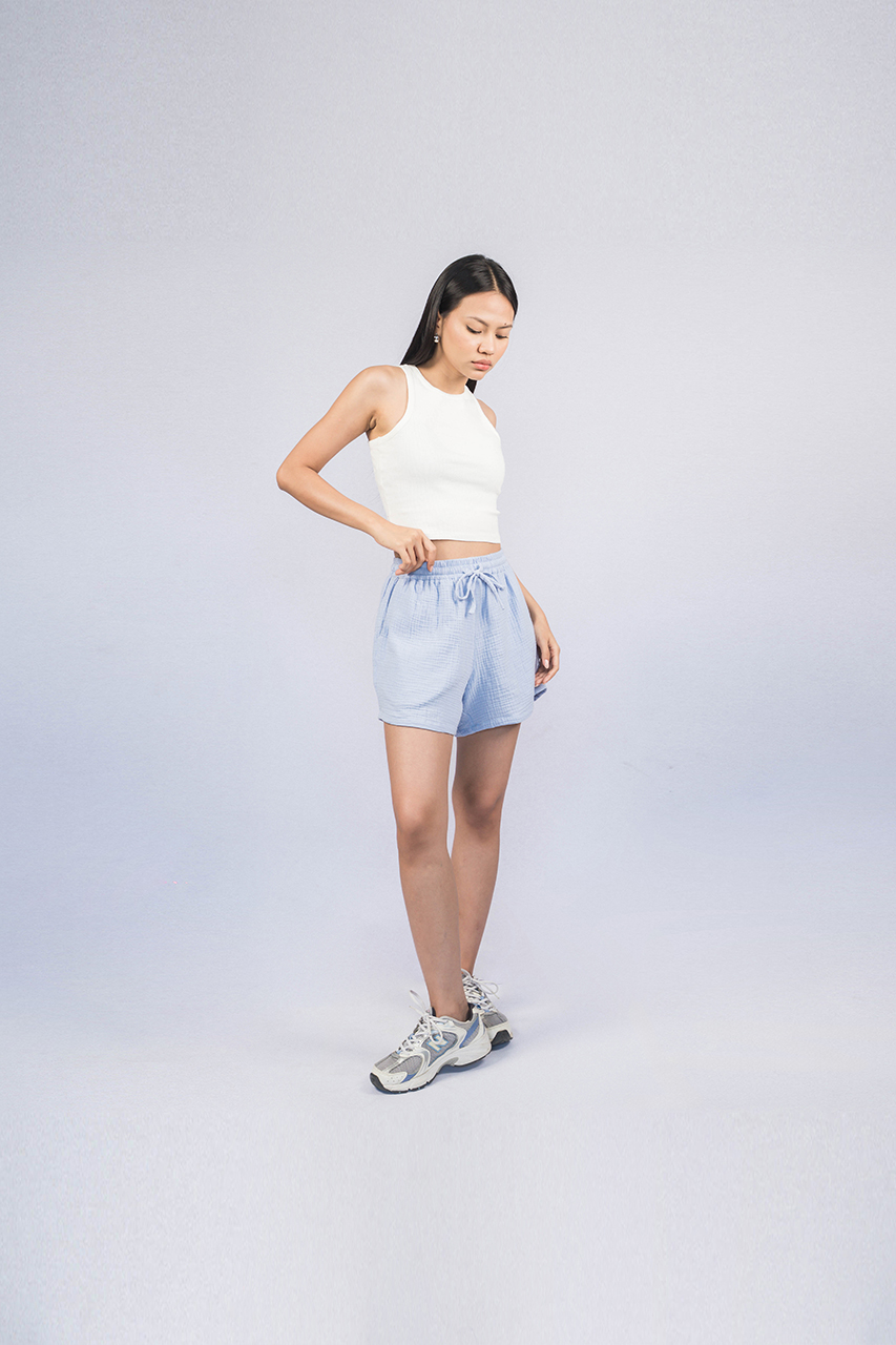 The LINA Sweat Short is made from cotton bubble crepe, offering soft texture and breathable comfort. It features a drawcord waistband and slice-side pockets for a practical, relaxed fit. Designed for women who value ease and movement in their daily wear.