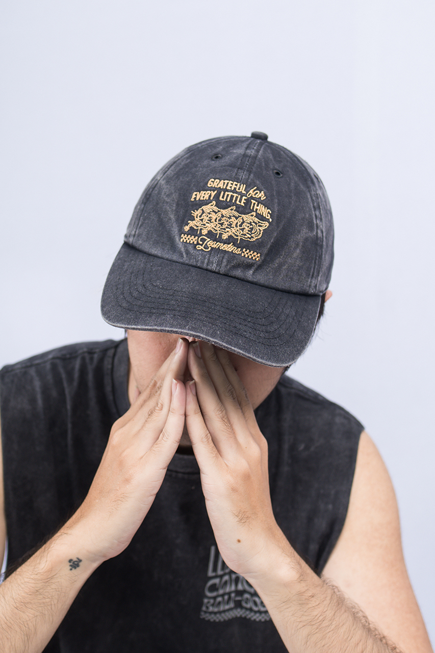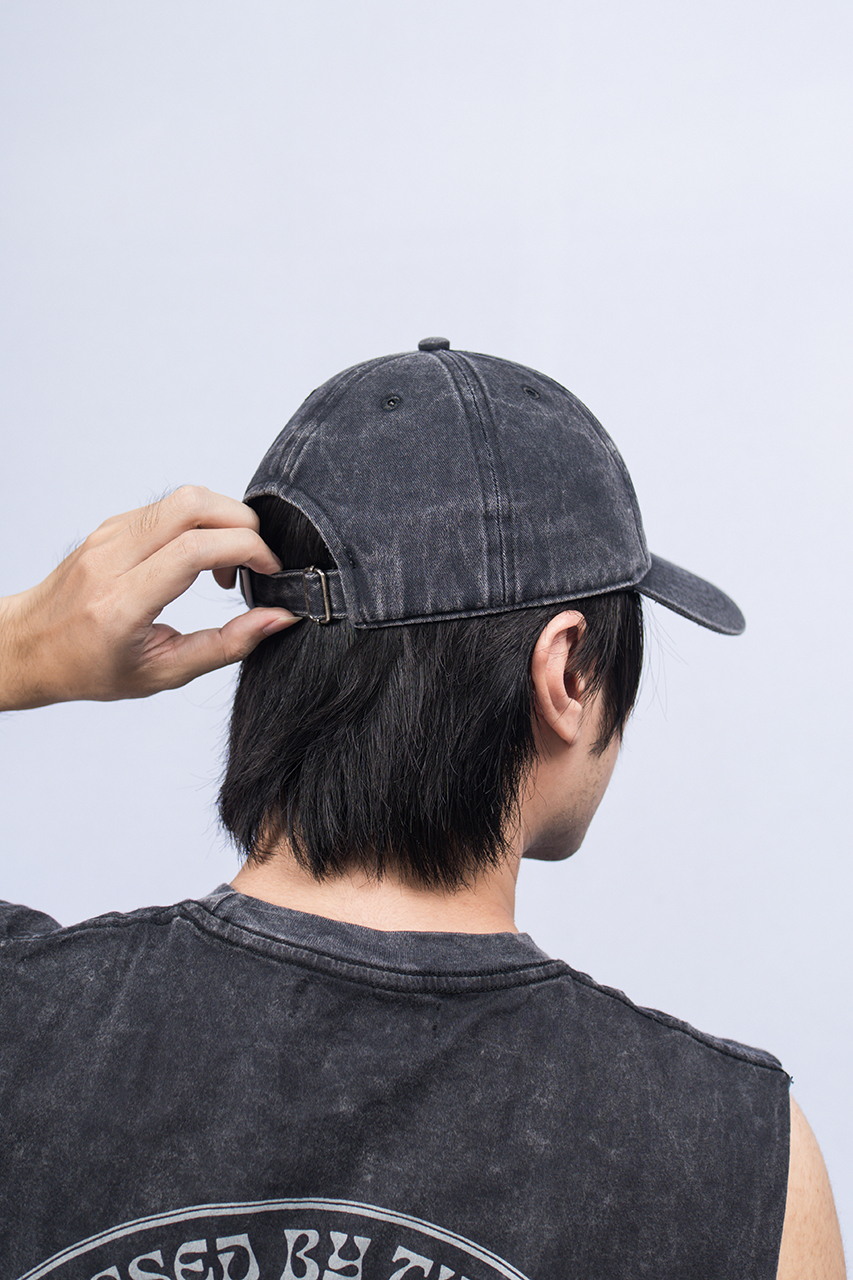 Charcoal wash 6 panel hat made of cotton twill fabric with an embroidered motif on the front, embroidered eyelets on top and adjustable strap ensures a snug and comfortable fit, while the bendable visor adds a touch of versatility to your ensemble.