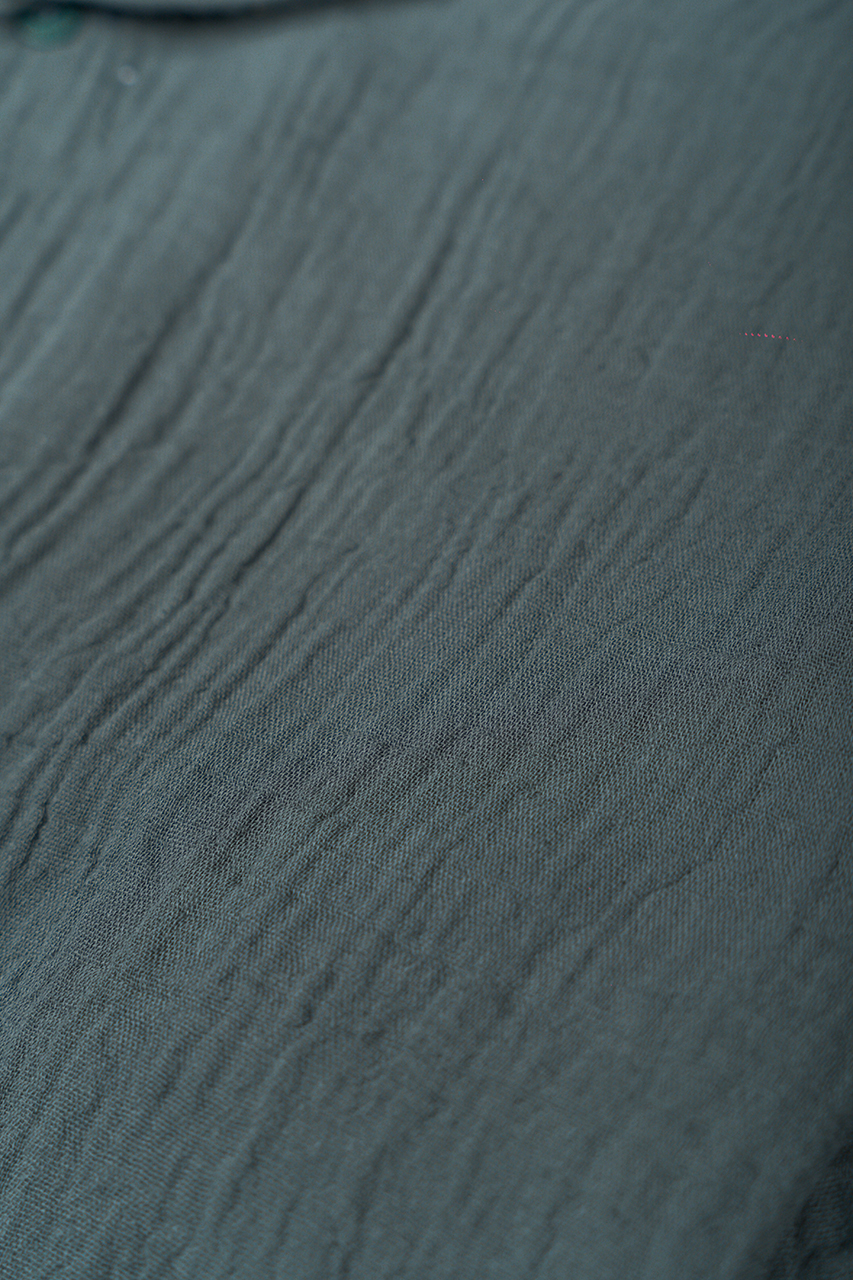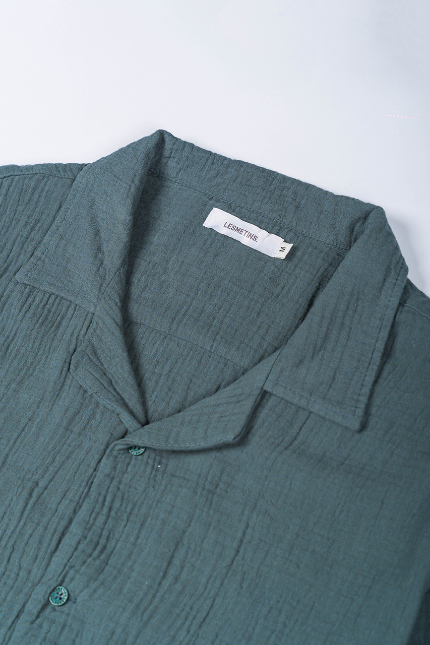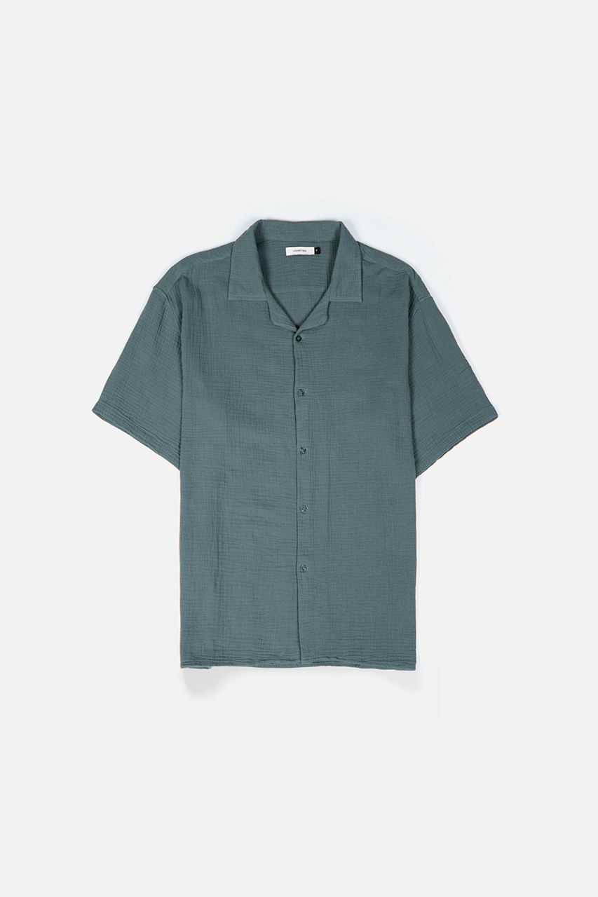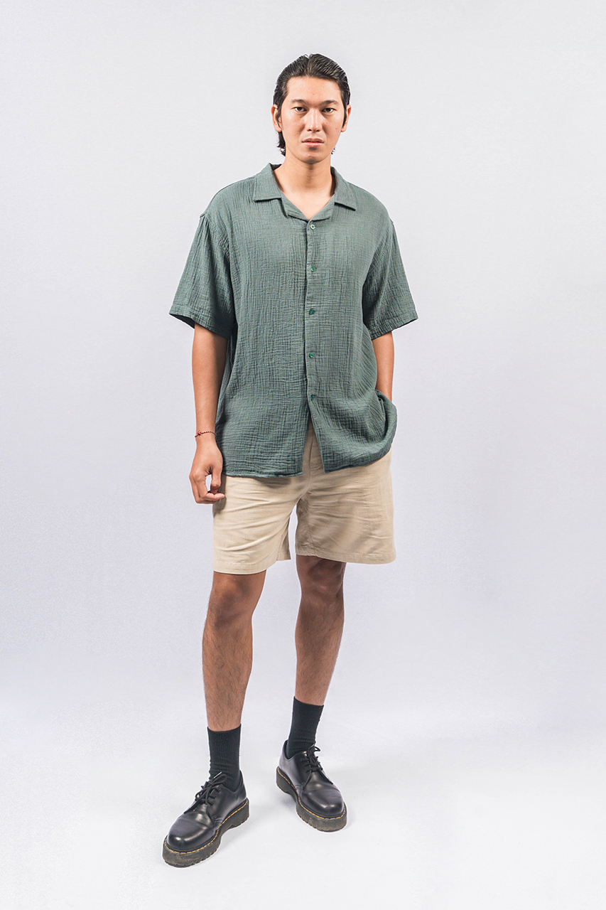 The POLIM Green Bottle is made with bubble crepe-texture cotton, giving it a lightweight and breathable feel. Designed with an open collar and relaxed fit cut, it offers easy movement and all-day comfort. A versatile piece you can style for casual outings or chill everyday looks!